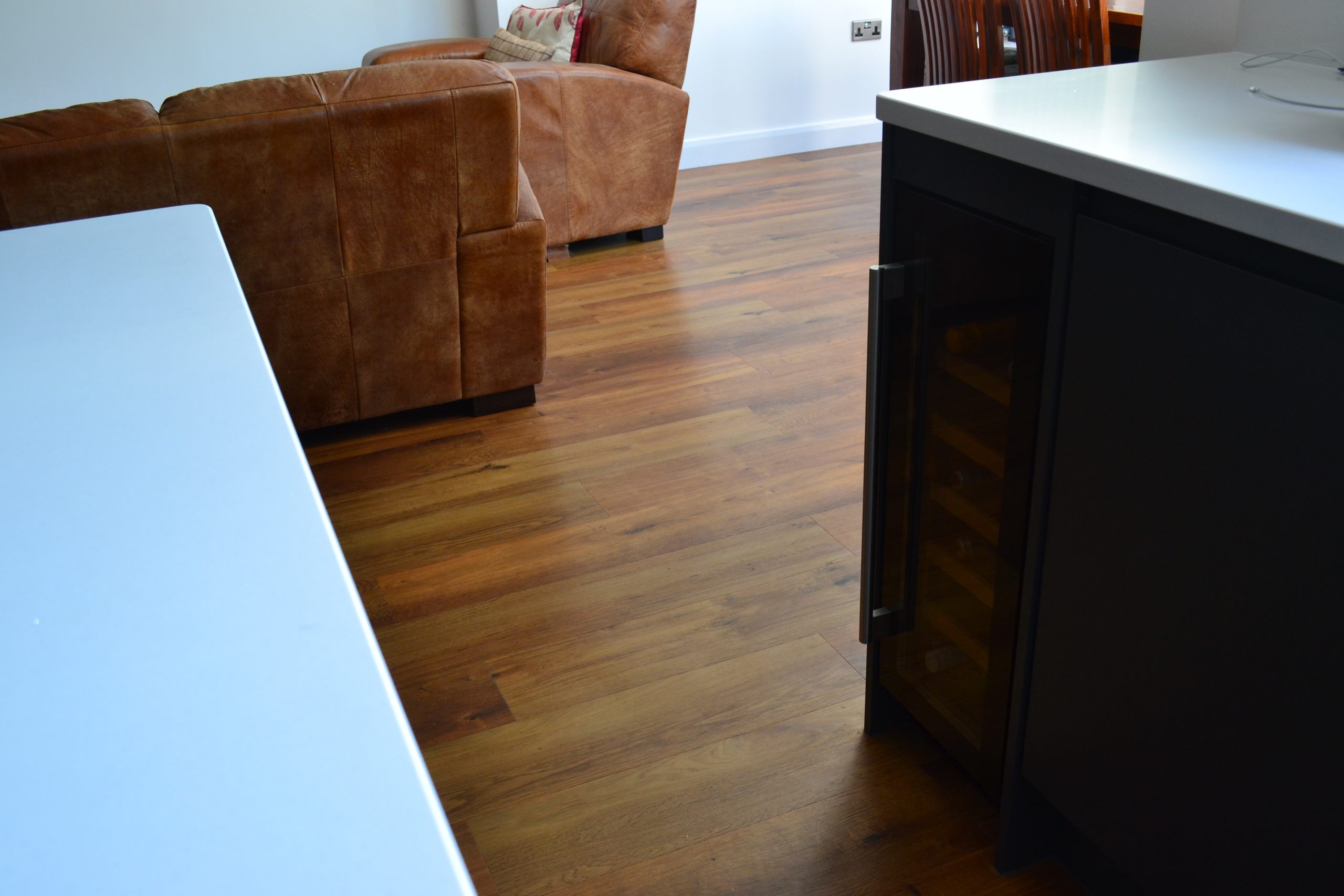 The kitchen proved rather more complex and challenging as Mr and Mrs Spickett had knocked through from their kitchen to the lounge area to create more space and were keen to select flooring in keeping with that. Mrs Spickett wanted to achieve a retro-modern look, combining her modern kitchen appliances with her retro sofa and dining table, with the flooring aiming to match the sofa and dining table.